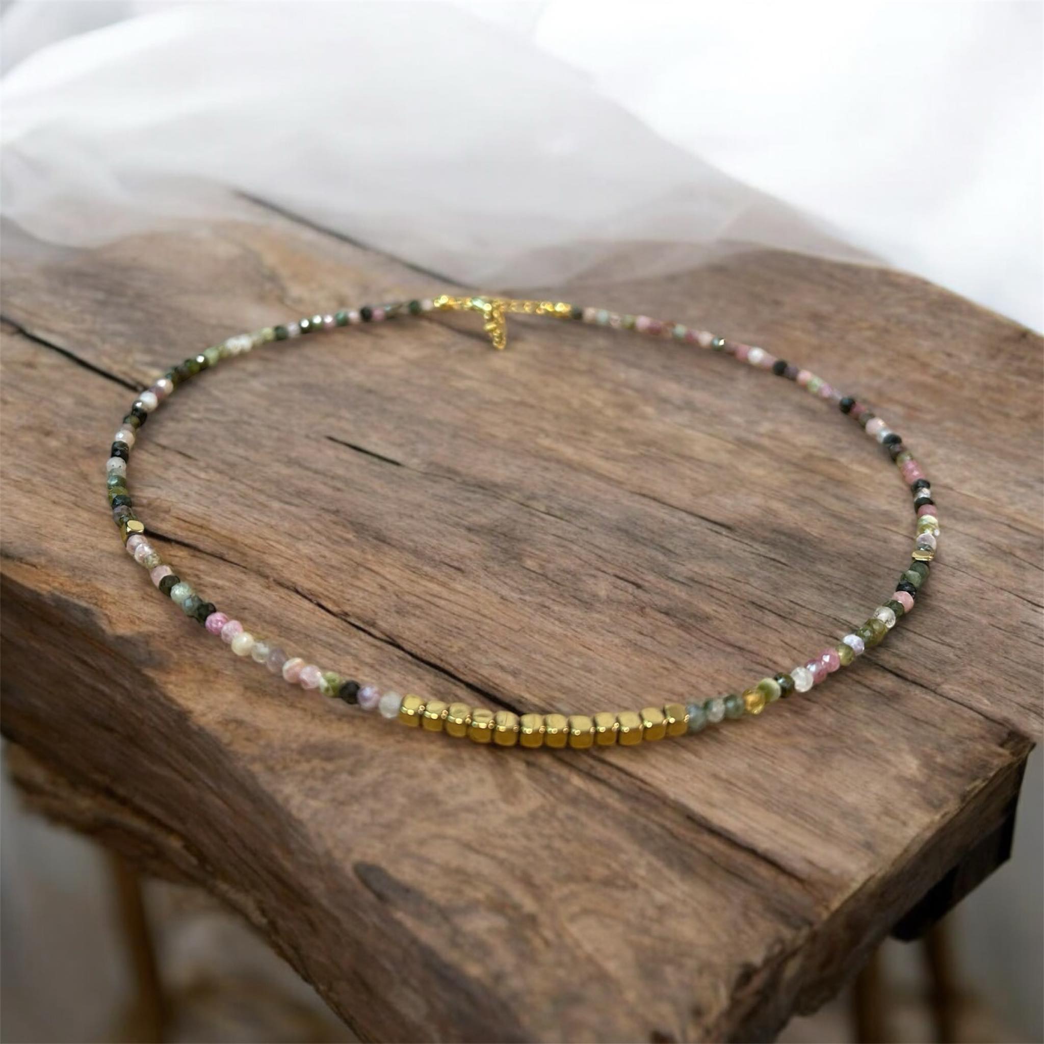 Ръчно изработено колие или гривна от нежни 3 мм разноцветни мъниста полускъпоценен камък турмалин фасетирани; златист хематит куб и висулка от най-висок клас медицинска стомана с 18К златисто покритие.