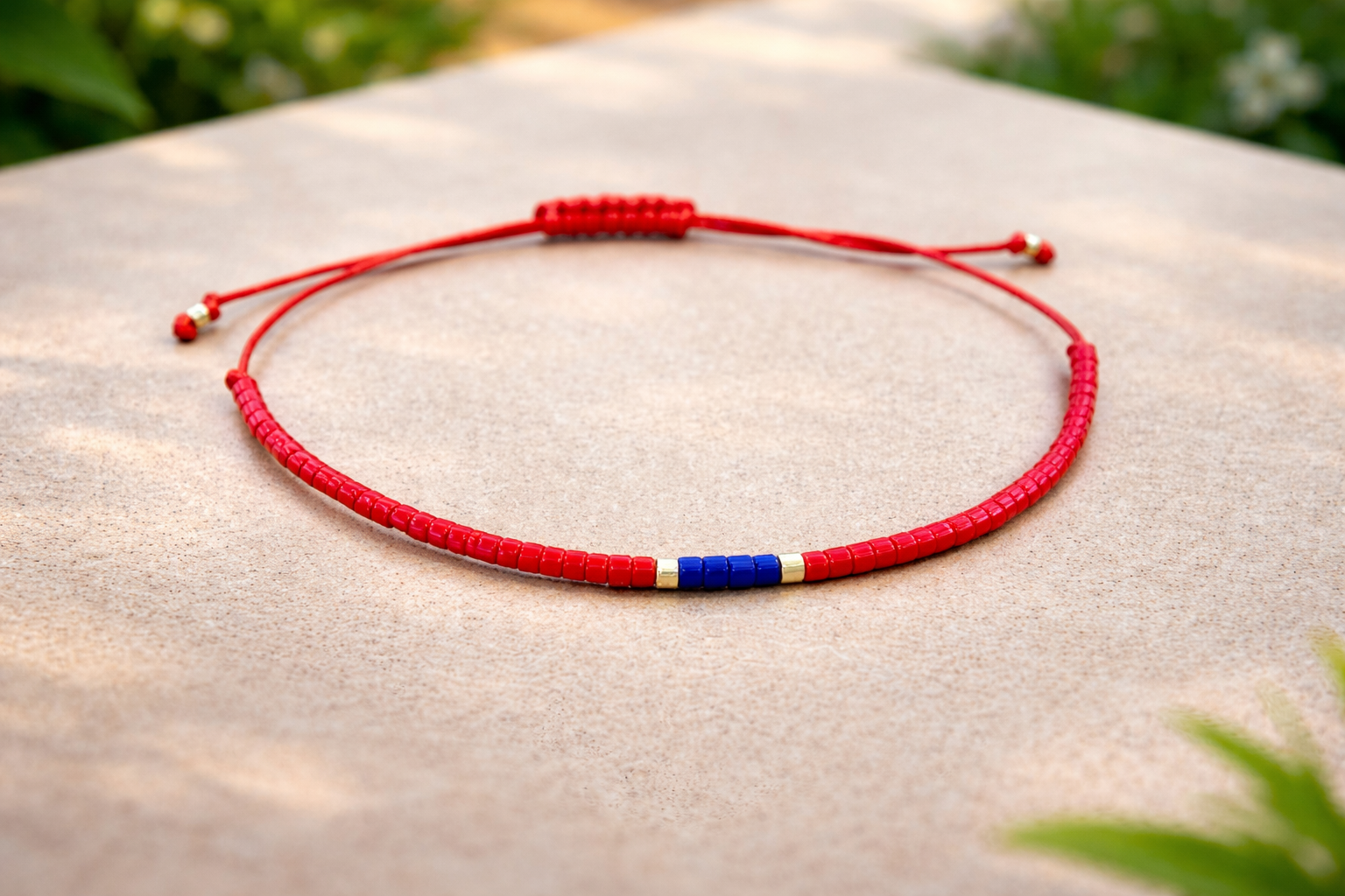 Нежна и символична гривна, изработена от фин червен конец – традиционен талисман за защита от уроки и негативна енергия. Червеният цвят от векове се свързва със сила, късмет и закрила, а деликатните мъниста в синьо и бяло добавят хармония и баланс.
