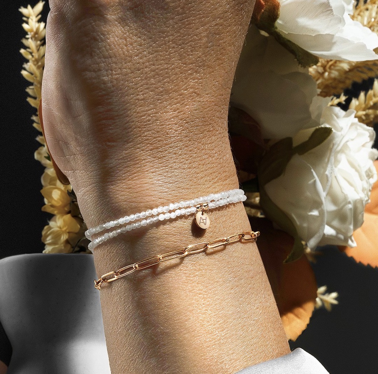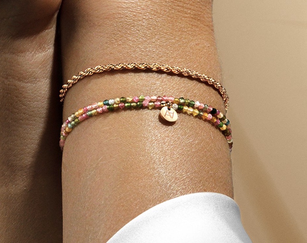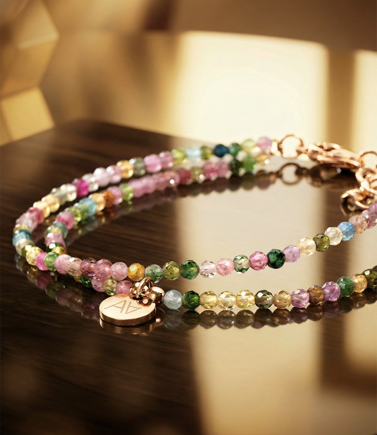 Елегантни двойни гривни за ръка, съчетаващи красотата и енергията на естествените камъни. Изработени от многоцветен турмалин, черен турмалин, бял лунен камък и розов кварц, тези гривни носят баланс, защита и нежна женственост.