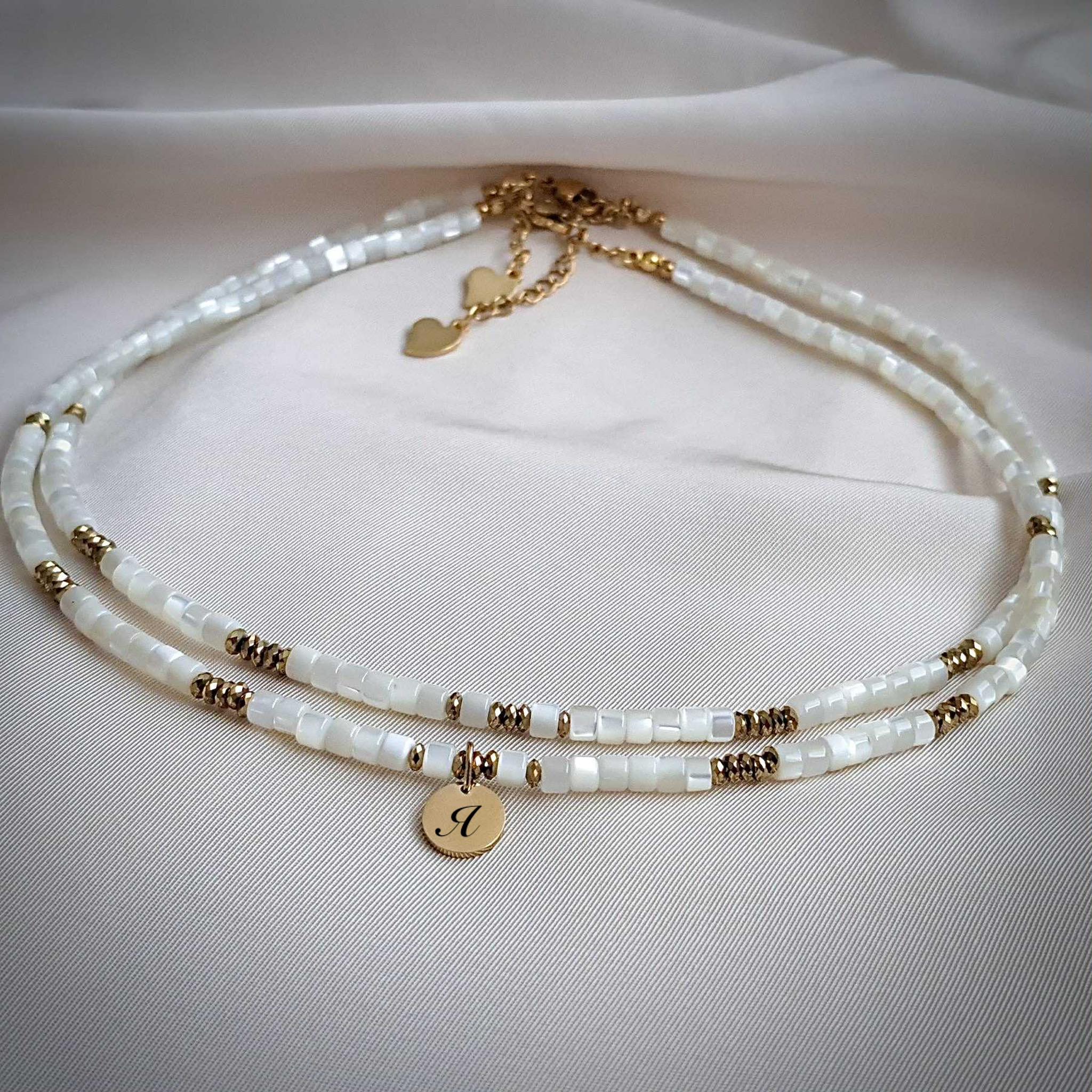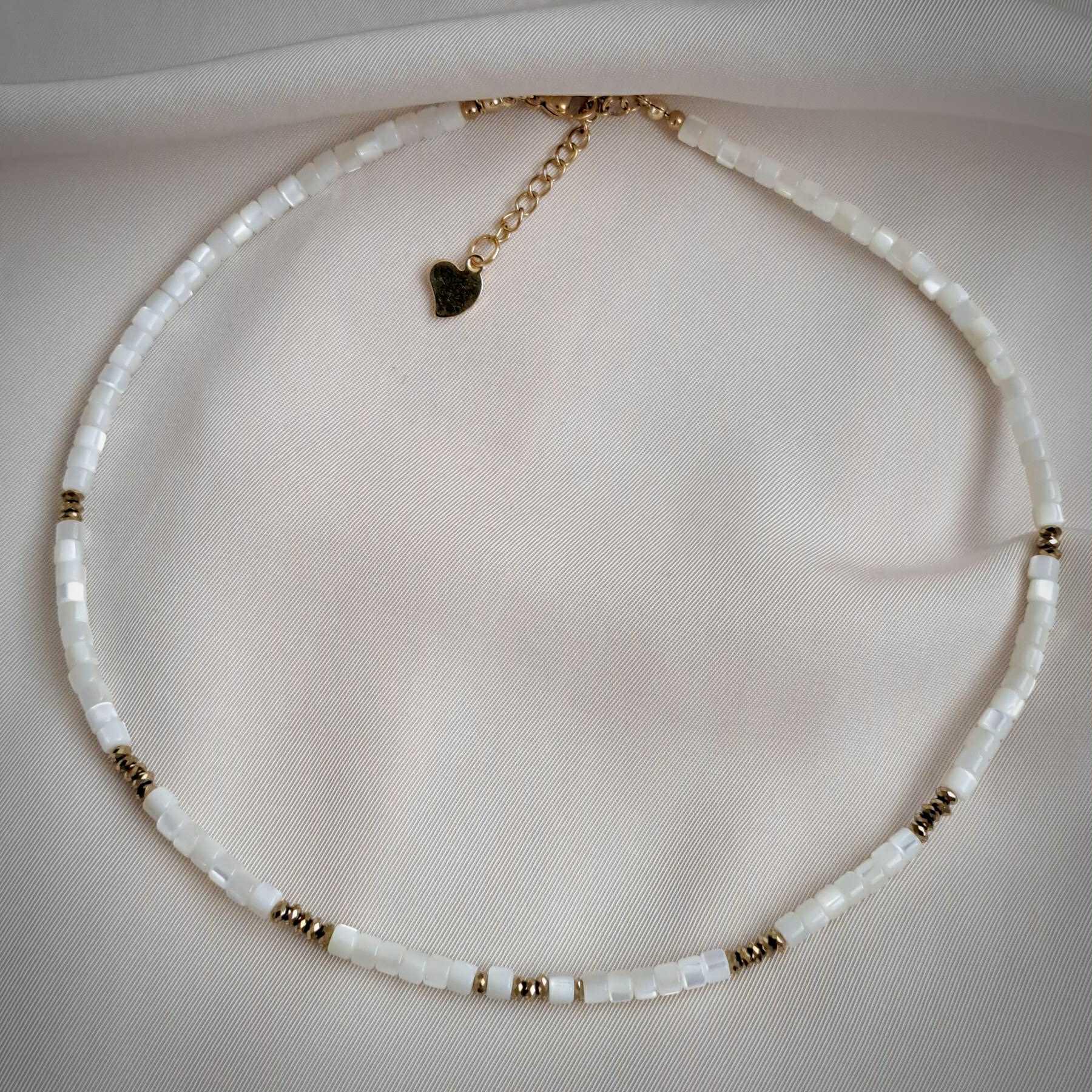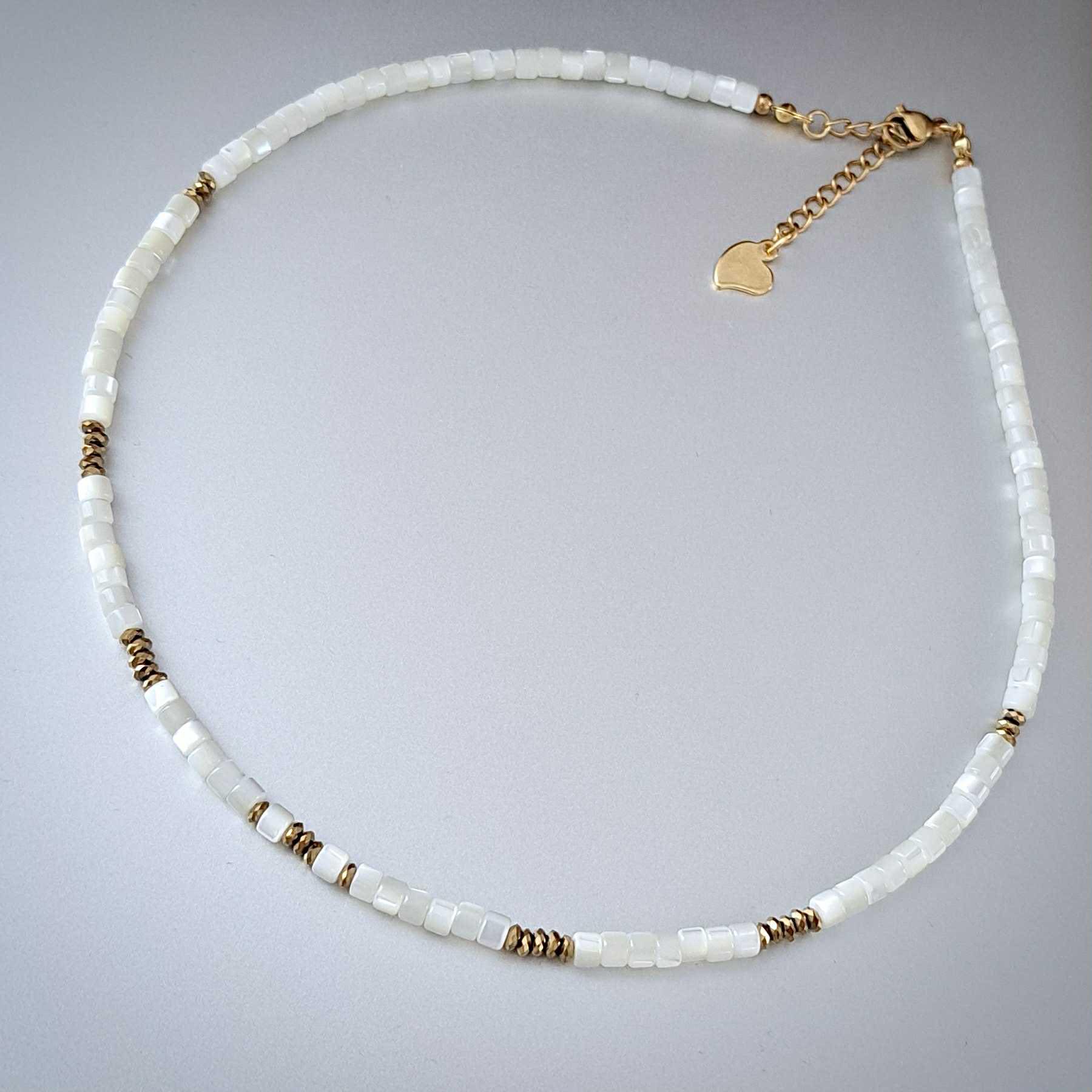 Ръчно изработено изискано и деликатно колие, изработено от шайби естествен седеф и хематит в златист цвят. Съчетава мекото сияние на седефа с елегантния блясък на хематита, създавайки усещане за хармония и баланс.