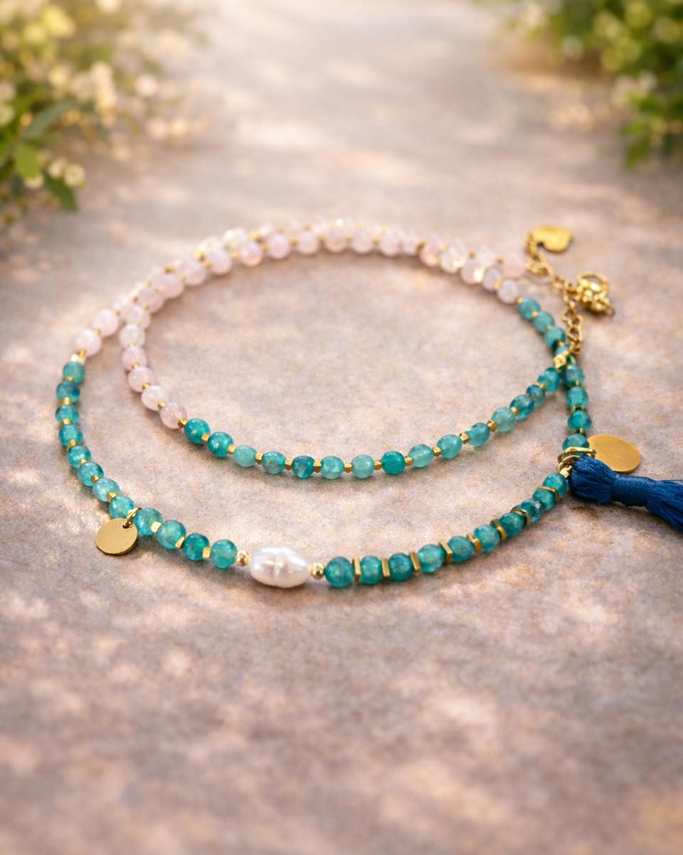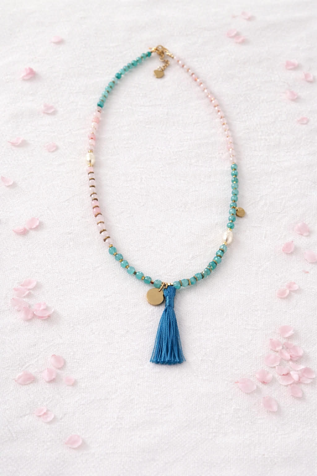 Фино, ръчно изработено колие, съчетаващо нежни цветове и естествени полускъпоценни камъни. Бижуто е изработено от фасетирани мъниста жадеит и розов кварц, допълнени със златист хематит и естествени перли, копринен пискюл и висулки от висококачествена медицинска стомана, които могат да бъдат гравирани с букви по избор.