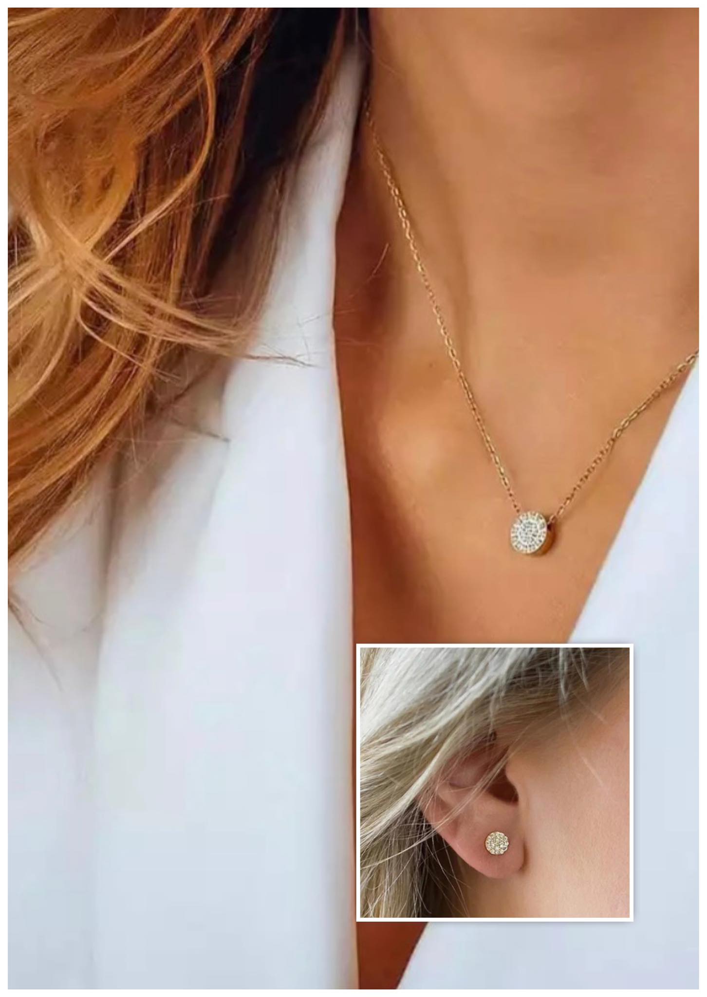 Нежно колие по врата и обеци налични в златисто и сребристо, инкрустирани с цирконии.