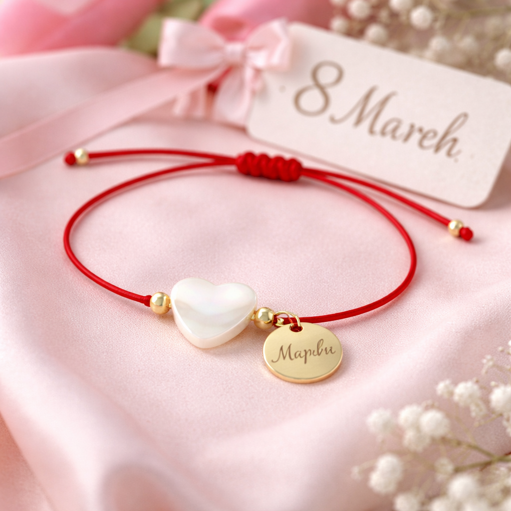 Стилна и нежна гривна с гравирано име по ваш избор, с фин червен конец и сърце от естествен седеф – символ на чиста и безгранична обич. Елементи от медицинска стомана с 18К златно покритие. Не потъмняват и не променят цвета си. Минималистичният дизайн придава изящество, а сърцето добавя мек блясък и елегантност. Лека и удобна за ежедневно носене, гривната се регулира лесно и пасва идеално на всяка китка.