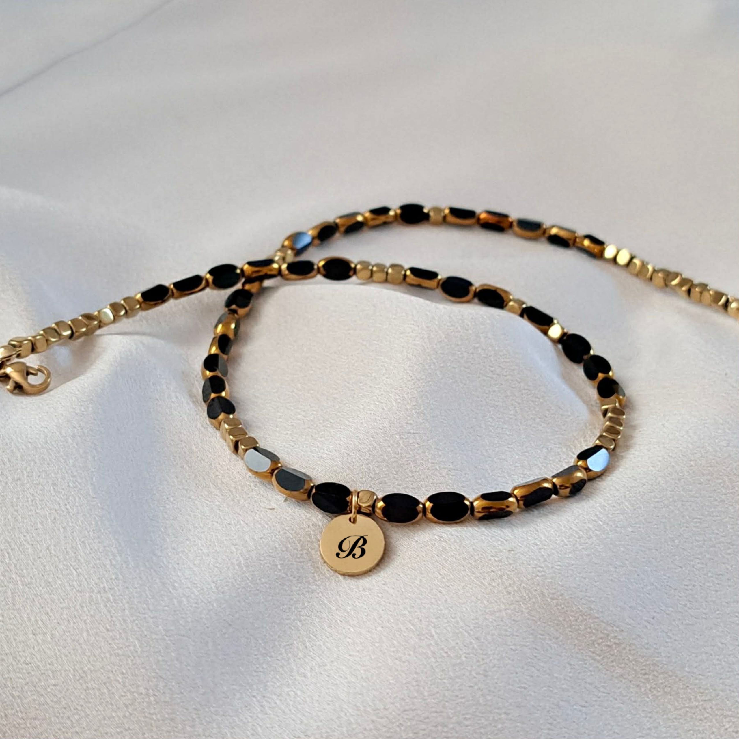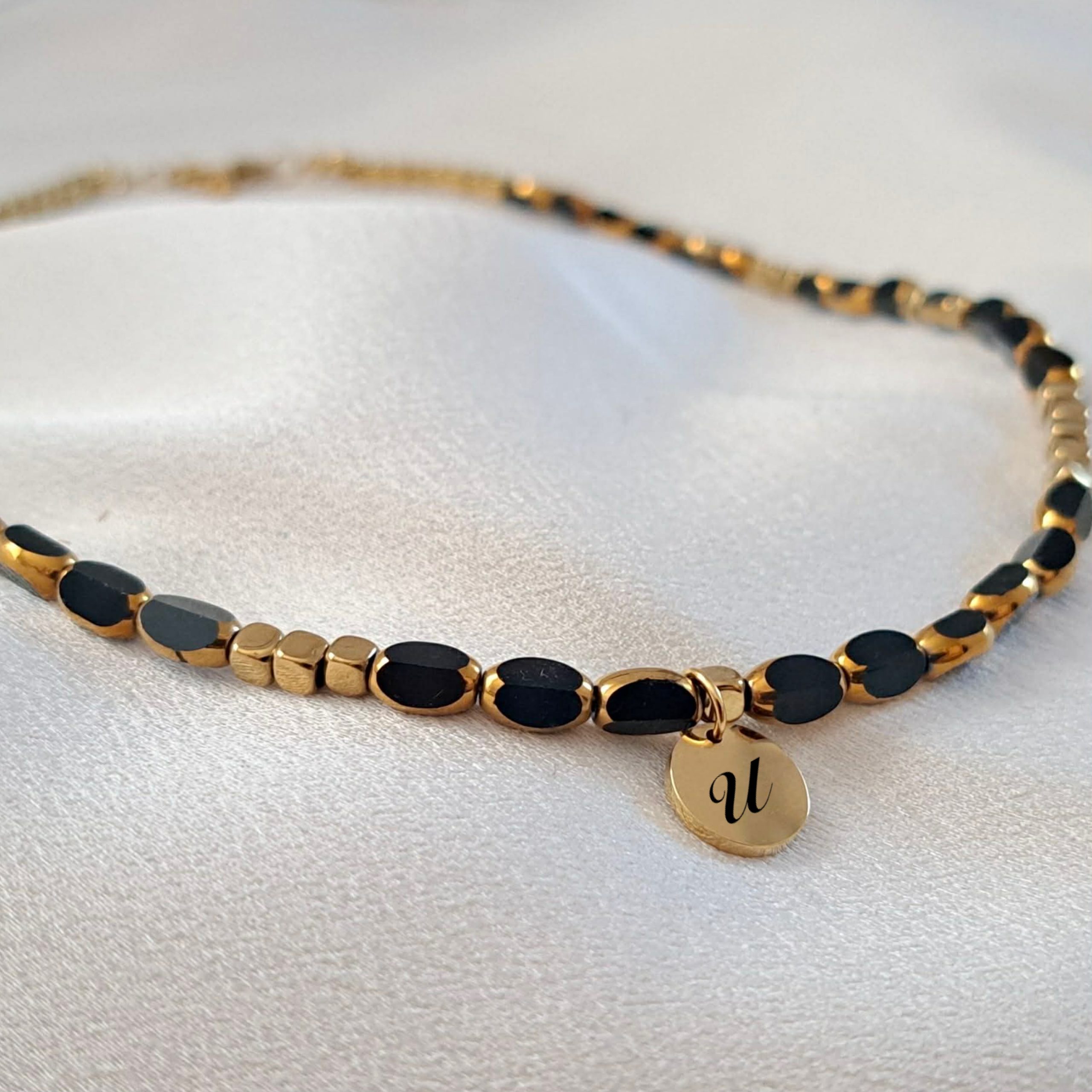 Ръчно изработено колие със стъклени мъниста в черно и златисто 6 мм, златист хематит куб 4 мм и стоманена висулка, която може да бъде гравирана с буква по избор.